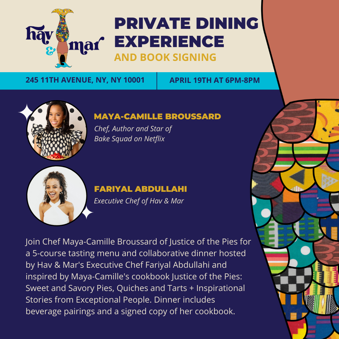 Join Chef Maya-Camille Broussard of Justice of the Pies for a 5-course tasting menu and collaborative dinner hosted by Hav+Mar's Chef de Cuisine Fariyal Abdullahi and inspired by Maya-Camille's cookbook Justice of the Pies: Sweet and Savory Pies, Quiches and Tarts + Inspirational Stories from Exceptional People. Dinner includes beverage pairings and a signed copy of her cookbook.